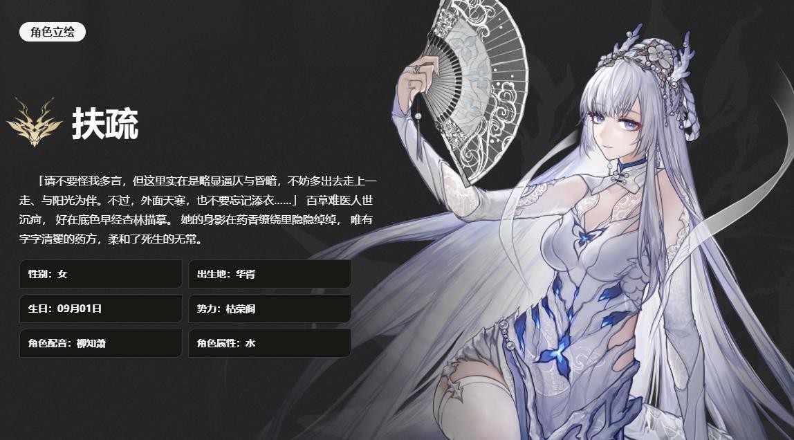 扶疏是众多角色的其中一个,这个角色会身穿一身白衣,在游戏里的定位是泽被苍生,作为一个水属性的角色,攻击力虽然并没有那么优秀,但是在对战的过程中可以主打治疗和辅助,如果想要对这个角色进行培养的话,那么玩家就需要多去提升角色的治疗技能,比如多通过等级的提升,让角色的技能达到满级,这样才能保证在对战的过程中,角色的治疗能力可以覆盖整个队伍的所有成员,另外还需要去提升神归心舍这一项技能,不但可以产生护盾,同时还可以在对战的时候紧急治疗,玩家可以在关键性的节点释放,可以帮助自己或者队伍的其他成员恢复生命值。