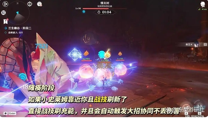 ③此时BOSS瘫痪倒地,普攻触发大招协同攻击对敌,战技刷新后同时连接贴脸的史莱姆与爆炎树,不损失伤害的同时为下一波大招提前充能。后续2、3波都是如此公式化输出即可。