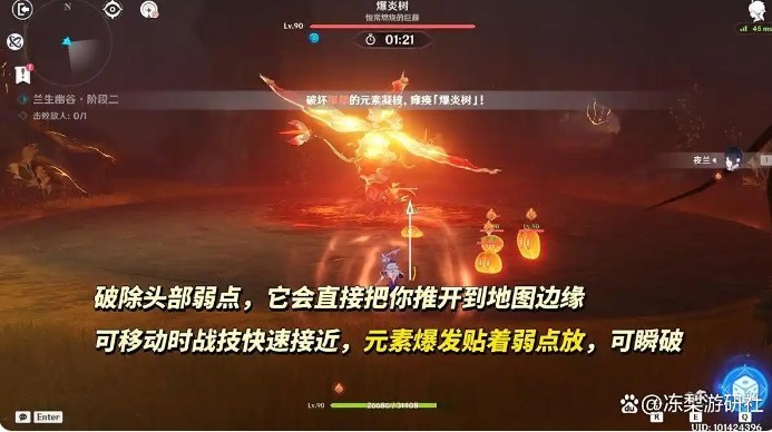 ②随后爆炎树会蓄力并推开周围角色,当气压结束战技连线史莱姆的同时奔向爆炎树,元素爆发强水可直接破除底部弱点;