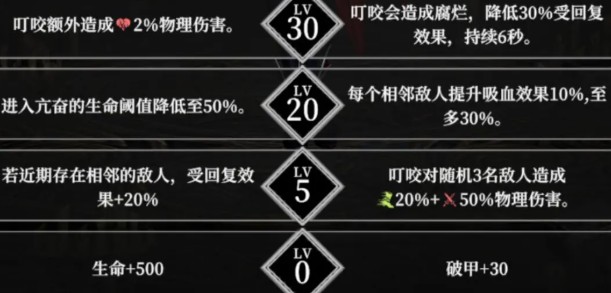 她的天赋在初始会解锁加30破甲,以及加500生命,升到5级时解锁若近期存在和自己相邻的目标,提升20%受回复效果,以及叮咬变成对范围内随机三人造成输出,升到20级能解锁让进入亢奋的生面阈值降低到50%,或每个相邻的敌人提升自己10吸血效果,升到30级能解锁让叮咬额外造成2%生命值的物理输出,或叮咬降低目标30%受回复效果维持6秒。