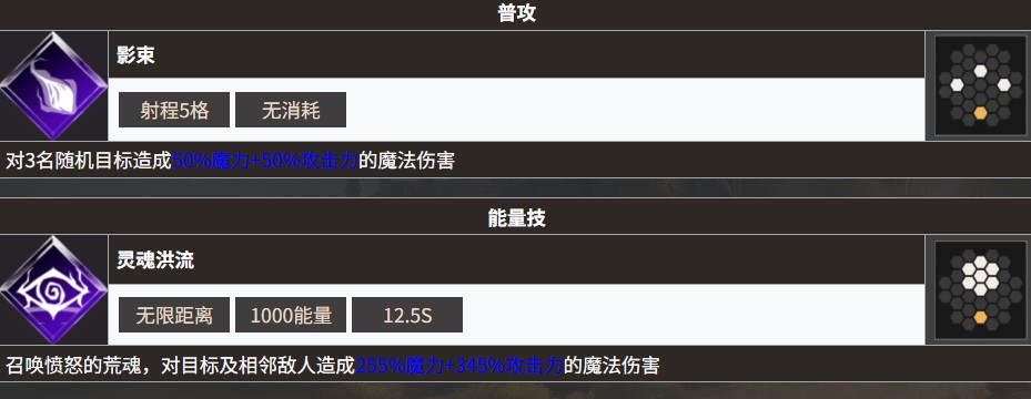 骨语蕾妮塔的核心优势在于独特的 "双线作战" 机制。普攻“影束”可随机攻击3名敌人,能量技“灵魂洪流”可以对目标及相邻单位造成巨额魔法伤害,爆发数值堪称同阶法师天花板。更关键的是被动“灵语之碑”,开场召唤的石碑既能独立输出,又能分担伤害,配合”汲魂“被动叠加增伤,最多可提升60%伤害,形成越打越强的滚雪球效应。