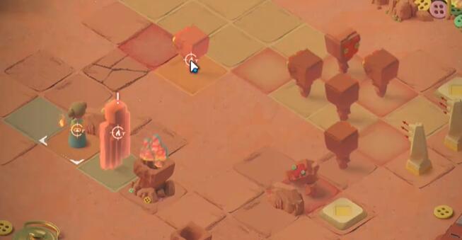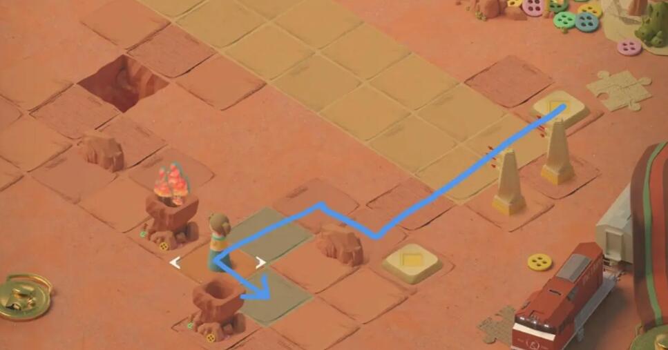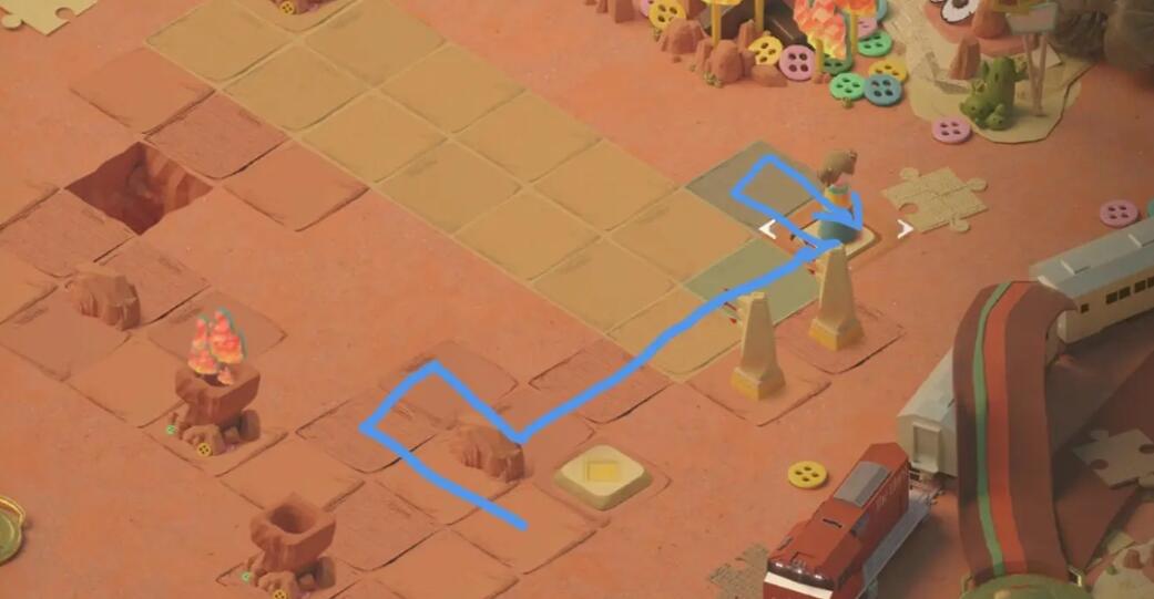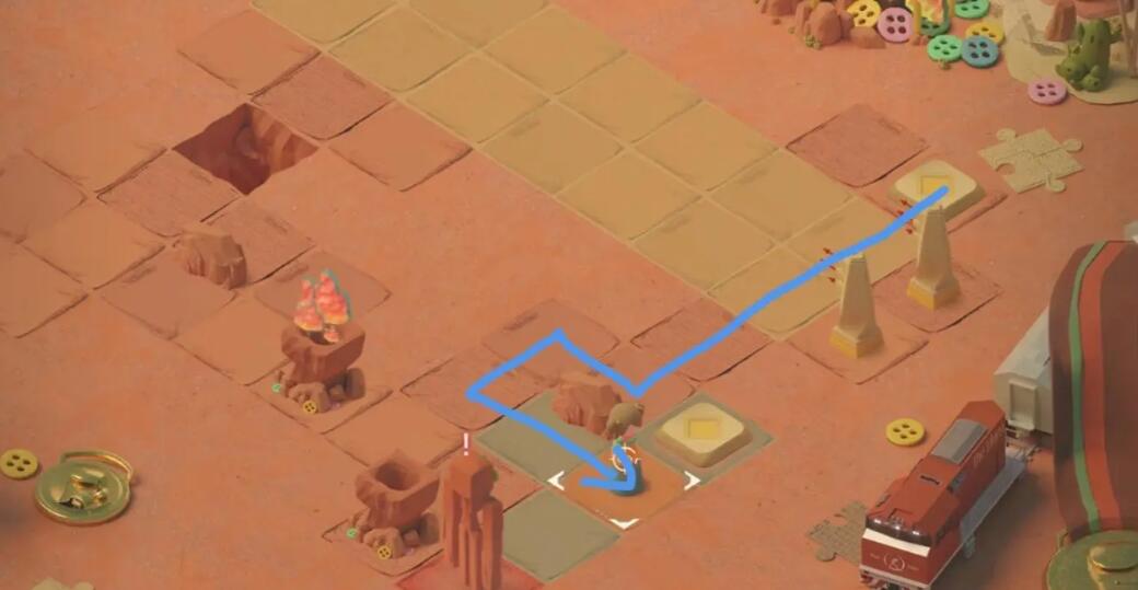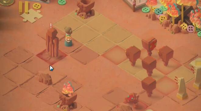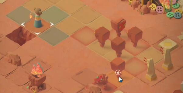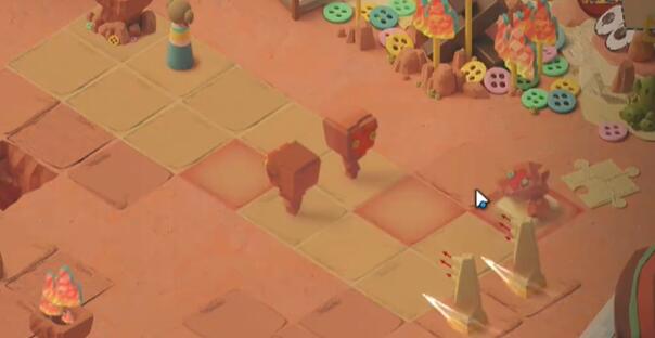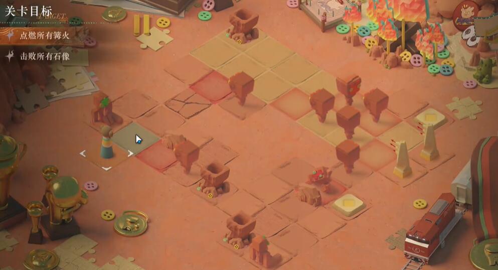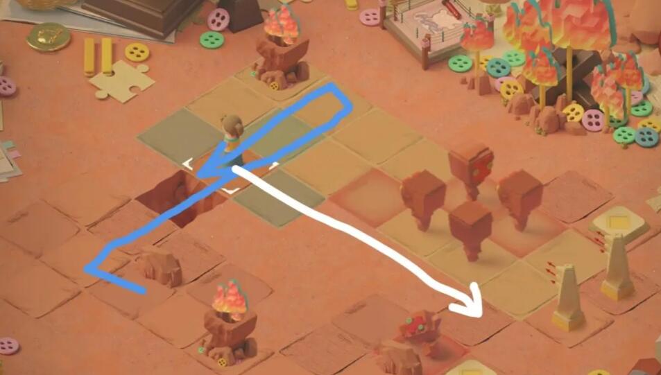 1、向上一格触发石像的追逐战,再向上一格后右转,击败右下方的石像,点燃篝火。