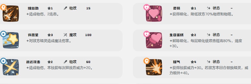 从输出方面来看,超级糖果就是绝对的主力,会有130威力的物理性伤害,这点还是很给力的,直接就可以获得一个萌化状态。触底强击也很有意思,魔法伤害基础大概是60个威力,要是放技能就刚好是能量耗尽。威力数值可以先加100打爆发还是比较好用的,另外还有一个迫近攻击。每一次在放完之后,威力就可以直接上涨20,叠加几次之后就可以直接叠满伤害,对于血厚的对手还是很管用的。
