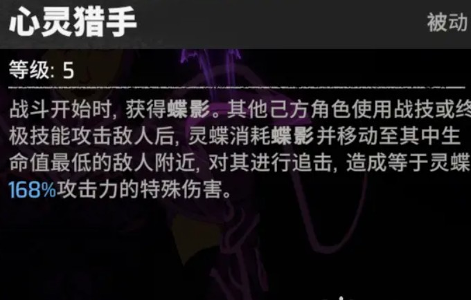 大家只能够接近敌人来造成特殊的伤害,无视对方护盾的效果,接着就是战斗技能意识化蝶,这个技能也是可以移动到目标敌人的位置,来对左右双方敌人造成特殊的伤害,还可以获得谍影,提高整体的伤害,这个技能会持续十秒钟的时间,大家可以来选择落点的位置,增加范围性的伤害,玩家们在使用的过程中,可以搭配高光时刻和神器来进行使用,还有一个专属卡也可以来获得增益的效果,选择神器的过程中,可以选择一个增加攻击,一个增加暴击的神器。