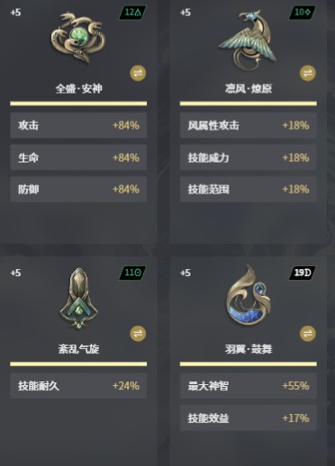 核心必带的魔之楔还是比较多的,例如选择全盛安神,可以获得84%的攻击,还有84%的防御以及84%的生命。生命以及防御加成就能让角色在近战贴脸打时更加的抗打。不管使用哪一种武器都可以很稳定的站在前排,就属于一个全方位提升的选择。那接着自然就是挑选凛风燎原,可以获得18%的风属性攻击,还有18%的技能威力以及18%的技能范围,就能完美符合风属性输出的定位。在使用突击枪时,风弓还有技能威力加成就可以让单体爆发更出色。