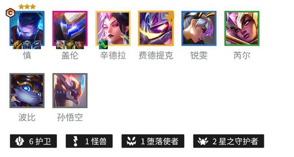 2、阵容羁绊:6护卫+2星之守护者+1怪兽+1堕落使者。