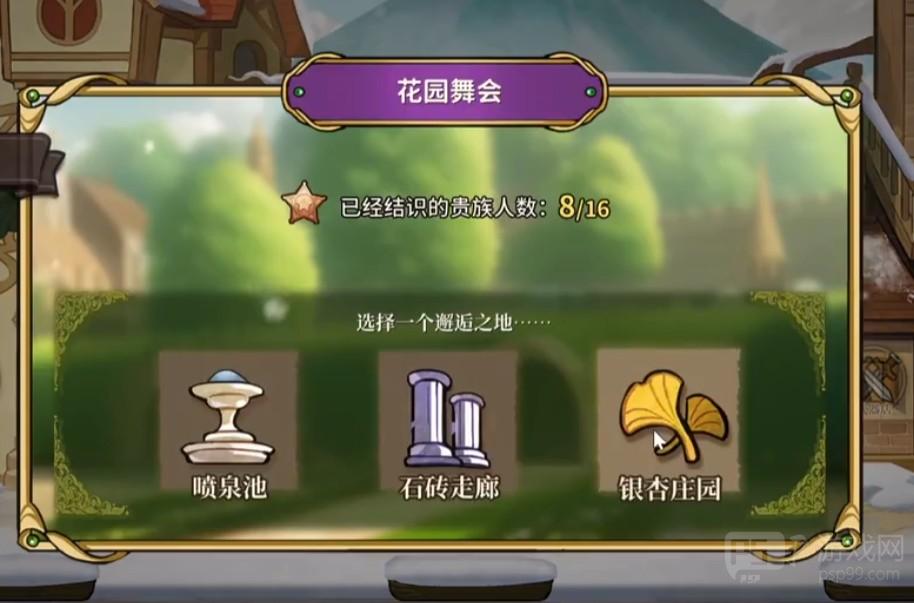 在花园舞会中,贵族们分布在三个区域,分别是喷泉池、走廊和银杏庄园。首先玩家们将会来到喷泉池,这里一共有5个人,分别是骑士、舞者、肯尼斯、女主角和明星。继续往里走,将会来到石砖走廊,这里也有五名npc,分别为钢琴家、大臣、画师、大主教和大学者。再往里走就会来到银杏庄园,这里一共有六名npc,分别为伯爵夫人、宠妃、克劳德王妃、作家和乐师。