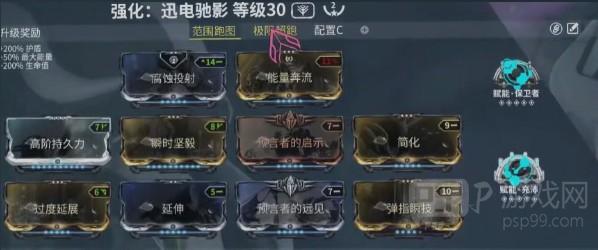 核心的思路就是平衡效率,还有泛用性。在配卡方面,可以选择能量奔流,腐蚀投射,还有高阶持久力,以及预言者的远见。在赋能方面可以选择保卫者,还有充沛,第1个可以提升生存容错的几率。第2个就可以保障能量的供给,有效解决持续高速移动过程中的能耗问题。这一套配置还是很有优势的,有200%的护盾,还有生命值加成,所以在快速转移时不容易暴毙,还有50%的最大能量提升,可以进一步的强化续航。