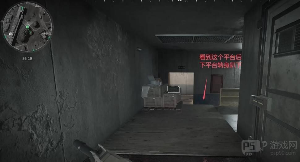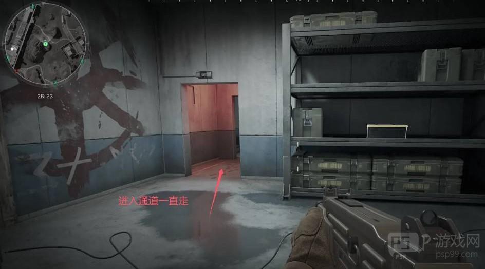 从出生点沿主干道向北,经仓库区东侧小路进入开阔场地。