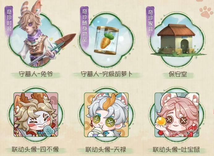 其中,特殊宝物具备双重用途:既可出售兑换金币,也可赠予联动角色(如兔爷、四不像、天禄、吐宝鼠等),触发专属剧情事件,呈现神兽群像的趣味日常互动;普通宝物则统一售出转化为金币,用于参与联动专属抽奖,奖池涵盖守墓人-兔爷奇珍时装、守墓人-究极胡萝卜奇珍随身物品、保安室主题家具、个人动作、头像框、线索以及碎片等多类道具。