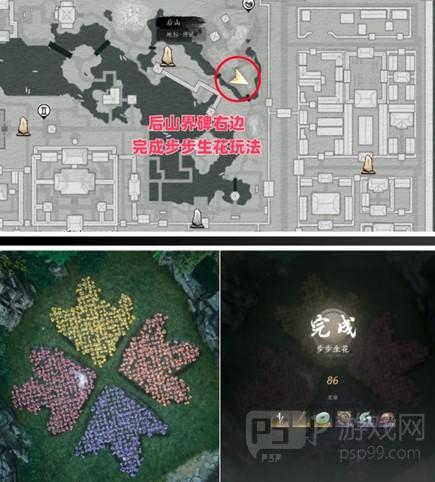 9、第9把宝钥:后山界碑右边完成步步生花玩法。