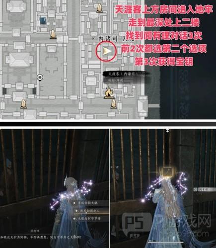 10、第10把宝钥:天涯客上方房间进入地牢,走到最深处上二楼,找到闻有理对话3次,内诸司前2次都选第二个选项,第3次获得宝钥。