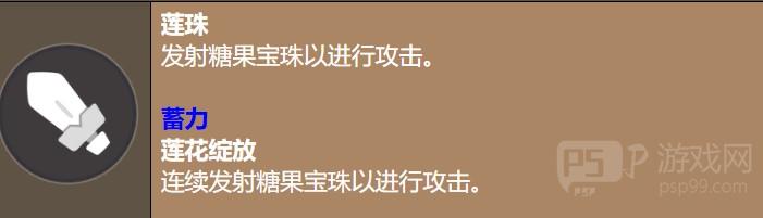 普通攻击叫「莲珠」,就是发射糖果宝珠攻击敌人。这个攻击的主要作用不是造成多高的伤害,而是稳定地给敌人叠「烦恼」状态。蓄力版本叫「莲花绽放」,会连续发射多颗宝珠,覆盖范围更广,适合面对多个敌人的时候用。在实际战斗里,普攻的频率要保持住,不然「烦恼」状态没叠上去,后面的技能伤害就会少一截。