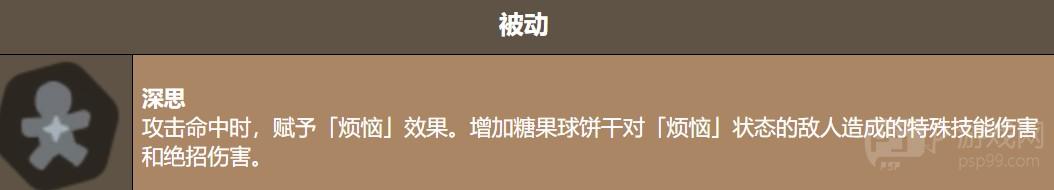 先说说她的被动技能「深思」。这个被动的核心就是,每次普通攻击命中敌人的时候,会给对方附上「烦恼」状态。听起来好像没什么,但关键在于,糖果球饼干对带有「烦恼」状态的敌人,特殊技能和绝招的伤害都会提升。也就是说,她的输出逻辑是先用普攻挂状态,再用技能打爆发。这个设计让她的输出节奏很清晰,不像有些角色那样要靠运气触发。