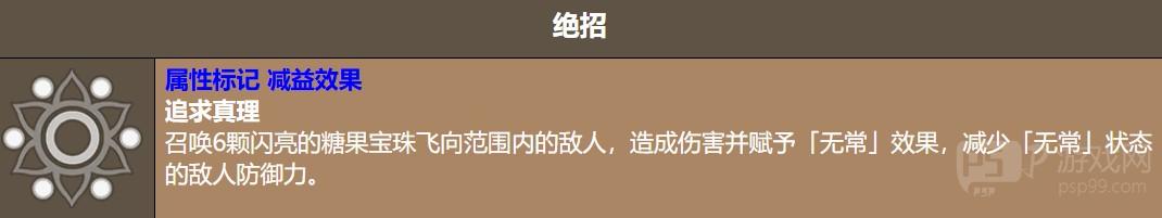 绝招「追求真理」是她最强的输出技能。释放之后会召唤6颗糖果宝珠飞向范围内的敌人,造成伤害的同时还会附上「无常」状态,降低敌人的防御力。这个减防效果对后续的输出帮助很大,不管是自己继续打还是队友跟进,都能吃到这个减防的好处。而且绝招本身也有属性标记,对弱点敌人的伤害加成会叠加上去,爆发力相当强。