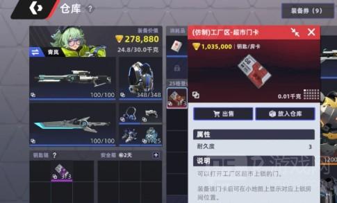 钥匙就属于一种消耗品,会有固定的耐久度,而且每使用一次就会降低一点耐久度。耐久度在耗尽之后,钥匙就会消失,高价值的钥匙,一定要选择妥善的保管。把钥匙装备好之后,小地图上就会直接有对应上锁房间的位置。进入地图之后,建议优先选择这些高价值的点位,可以迅速的拿到物资,还可以避开其他的玩家,将对方打一个措手不及。不同地图的钥匙房资源是各有各的侧重,例如工厂区的钥匙房,就可以刷新武器配件,山区的钥匙房就可以获得高级的材料,大家可以根据个人的需求去选择。