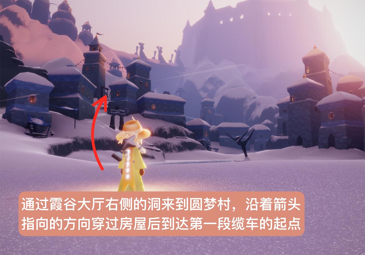 1、首先从霞谷右边的洞,进入圆梦村,来到下图指向位置;