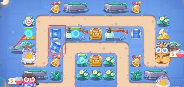 1、首先我们开局在如图所示位置放个冰锥塔,锁左侧钱袋。