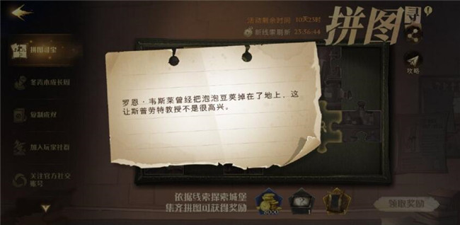 哈利波特今日线索:罗恩韦斯莱曾经把泡泡豆荚掉地上了。那么拼图具体在哪里?下面小编就向大家介绍罗恩韦斯莱拼图位置攻略,一起来了解下吧。