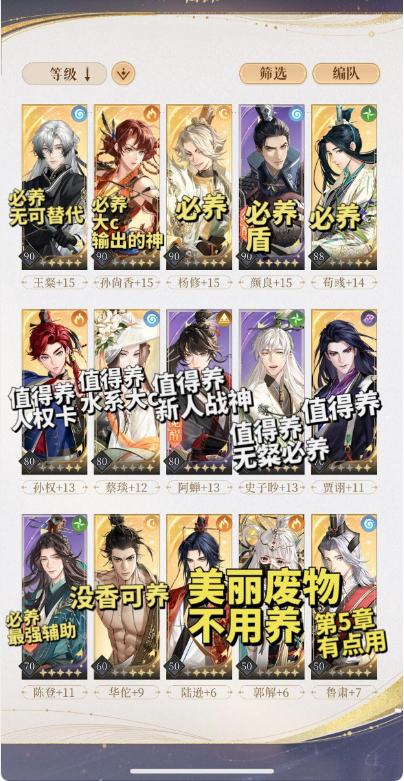 因为游戏中输出较多,并且大多可以被同练度的输出替代,所以我降低了一些输出的培养优先度(蔡琰、阿婵、张飞等)。