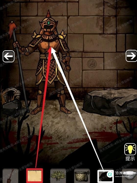 3、来到墙上有两个火种的地方,左边的小游戏是移动贝壳,解决可观看视频21.1.24、回到有铠甲的地方,点击铠甲身上,使用宣纸搭配碳,得到图案。21
