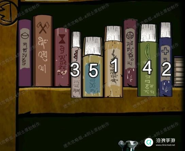 21、我们就可以知道这副画是一个提示,我们可以讲这个画根据书架上面山字图案横向旋转,然后,使用图像当中的顺序依次将图片当中的书本拉出来(如图拉动)。后面的暗格就会启动,可以得到铁片一还有书简提示。38
