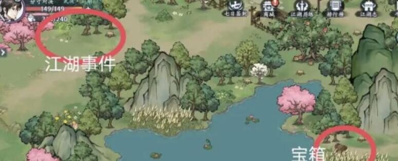 5、宝箱在中间,每日供奉和藏宝图在树下,还有一个宝箱需要点击山洞触发剧情,山洞里还有一个藏宝图。
