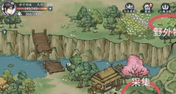 3、宝箱在中间,藏宝图在左下角,野外物资在上方,采集在右下角。