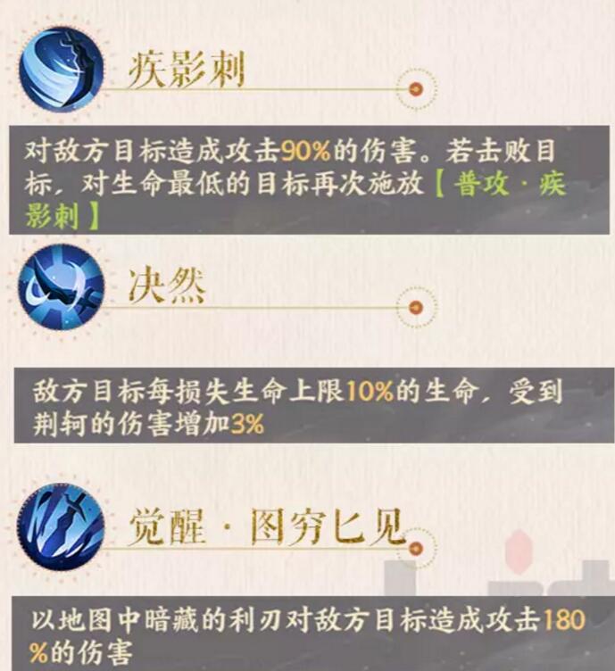 2、高渐离,天命技能[易水决],荆轲[觉醒.图穷匕见]无视敌方目标10%的防御。