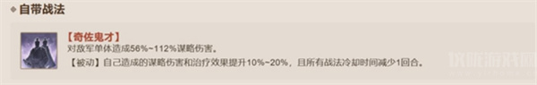 效果:对敌军单体造成56%-112%谋略伤害。[被动]自己造成的课略伤害和治疗效果提升10%-20%,且所有战法冷却时间减少1回合。