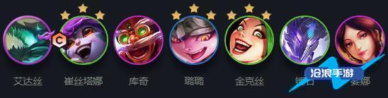 1、阵容组成:艾达丝、库奇、崔丝塔娜、金克丝、娑娜、璐璐、巴德