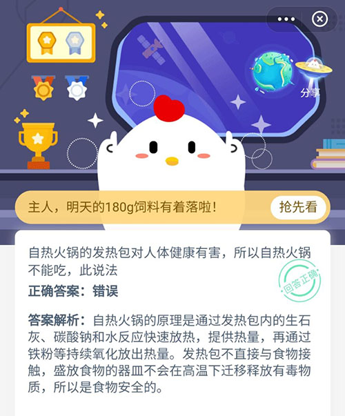 支付宝中的蚂蚁庄园又出新的题目了,赶紧一起来看看吧,生活中有超多小伙伴都非常喜欢吃自嗨锅,使用起来也非常的方便,让食物变熟当然也少不了发热包,那么自热火锅中的发热包对人体健康有没有伤害呢?下面一起看看正确答案吧。