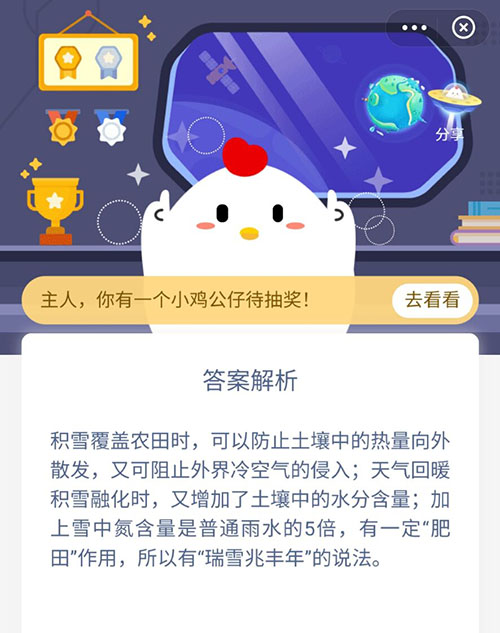 “瑞雪兆丰年”这句话相信大多数小伙伴都听说过,为什么说是瑞雪兆丰年?是因为下雪对农事有什么样的好处包吗?今天的支付宝小鸡答题就问到小伙伴这样一个问题,赶紧一起来看看瑞雪兆丰年下雪对农事的好处包括什么吧。