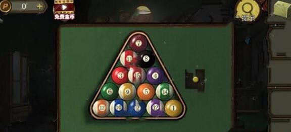 1、首先把台球全放台球桌上,根据图案提示把台球摆放正确位置得到黄色按钮。