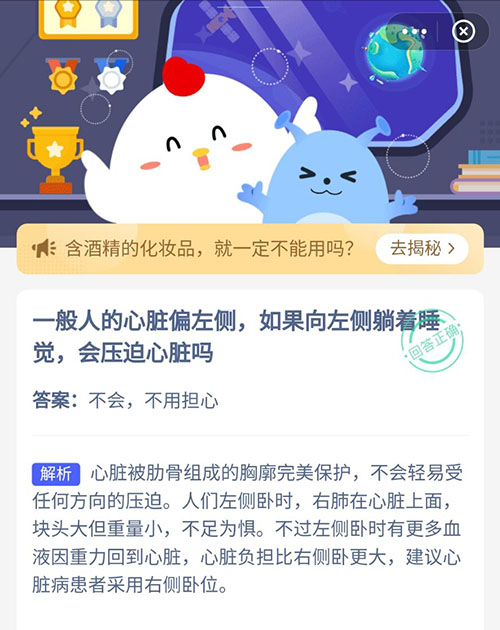 以上就是关于一般人的心脏偏左侧,如果向左侧躺着睡觉,会压迫心脏吗?这个问题的正确答案,获取正确答案的小伙伴赶紧去领取自己的小鸡饲料吧,明天也会持续为你更新正确答案哦,赶紧来关注吧。