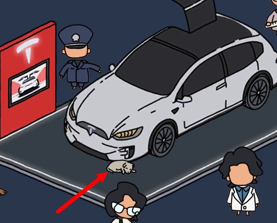 3、小狗是在这张地图的靠右一点的位置上,在一个车展上的一辆车头前面。车展旁边还有一个无障碍电梯和信息服务台,还是比较好认出来了。