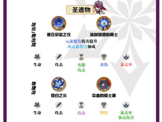 主属性:时之沙(元素充能效率、百分比攻击力)、空之杯(冰元素伤害加成)、理之冠(暴击率);