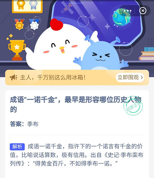关于成语一诺千金的故事小伙伴们知道多少,今天的支付宝小鸡答题就问到小伙伴这个问题,成语“—诺千金”,最早是形容哪位历史人物的?不知道答案的小伙伴赶紧一起来看看正确答案吧,答对就可以领取属于自己的小鸡饲料了。