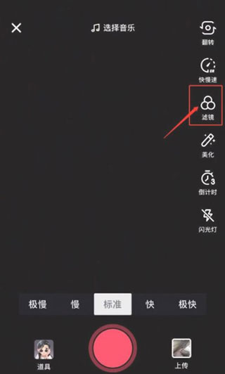 2、进入到抖音短视频的拍摄页面,我们可以看到右侧的操作菜单。我们先选择“滤镜”。