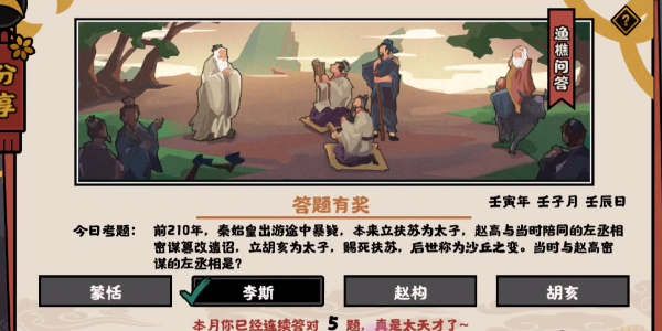 今日考题:前210年,秦始皇出游途中暴毙,本来立扶苏为太子,赵高与当时陪同的左丞相密谋篡改遗诏,立胡亥为太子,赐死扶苏,后世称为沙丘之变。当时与赵高密谋的左丞相是?
