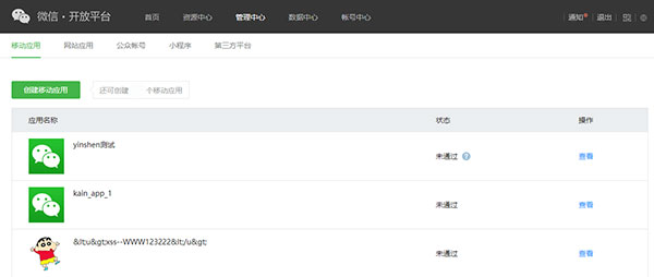 关联流程:登录微信开放平台—管理中心—移动应用,选择想要关联的APP,点击查看。