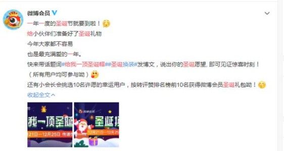 最后微博的小会长会在所有参与活动的小伙伴中选出3位幸运观众,按转评赞排名榜前10名获得微博会员圣诞礼包呢!还在等什么,快来参加吧。