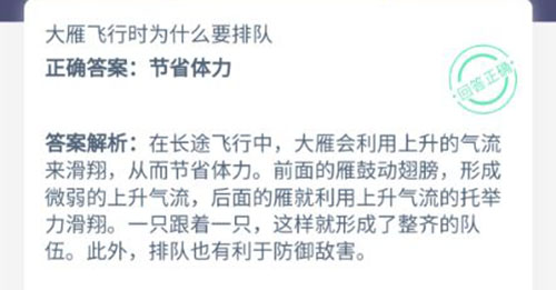 在今天的支付宝蚂蚁庄园中的小鸡答题中,问了各位小伙伴常识的小问题,大雁飞行时为什么要排队,大雁在飞行时候一般呈现“人”字形,或者是“一”字形,这样的队形是单纯的为了好看吗?下面一起来看看正确答案吧。