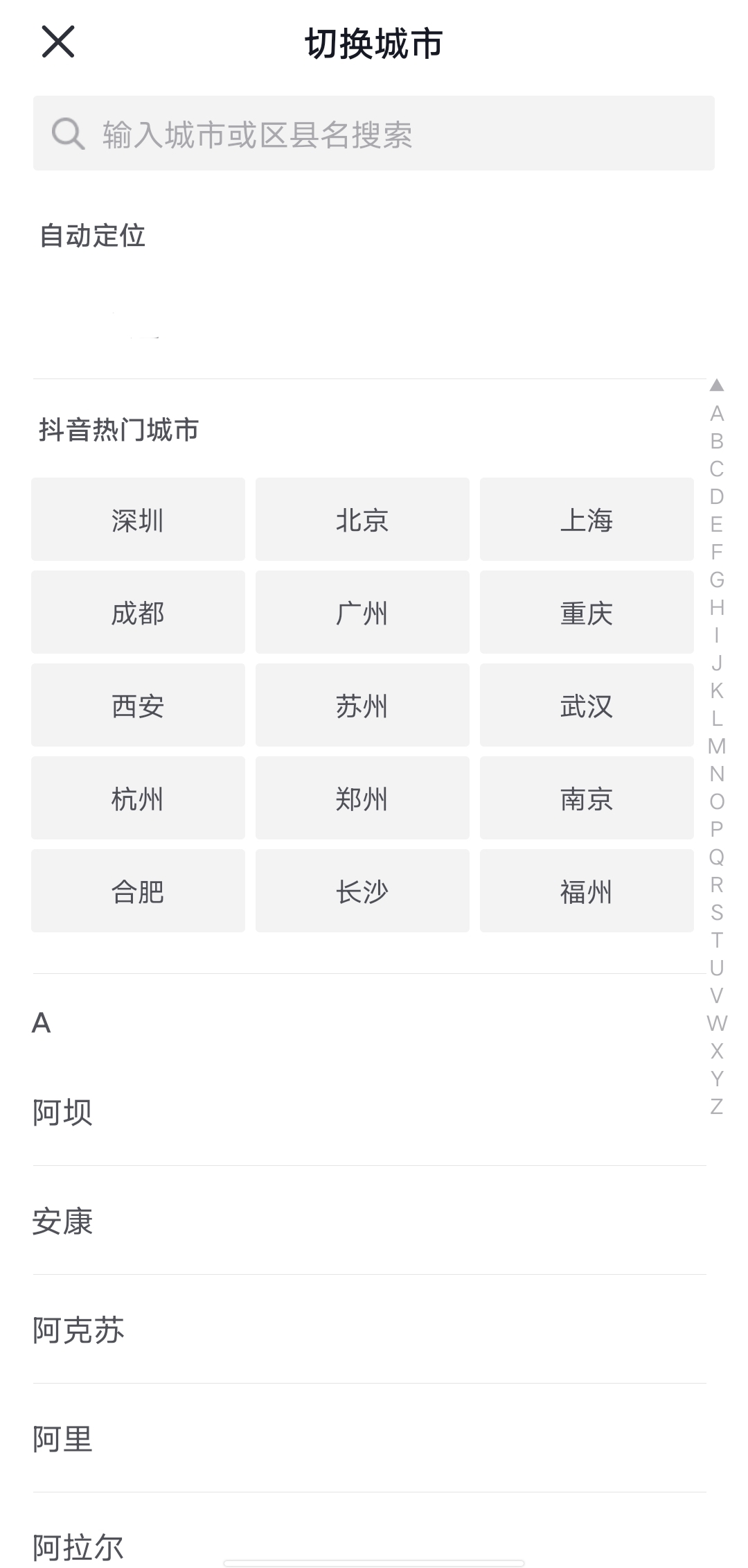 第四步,在弹出的“切换城市”页面中,即可选择想要定位的同城位置,查看指定地点同城视频。