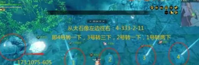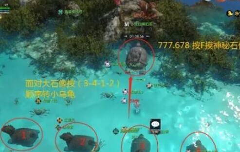 1、我们在坐标(173,1075-605)的位置开始下潜,然后看到一个大石像按f开启,第一个小乌龟转两下,第二个转一下,第三个转三下,第四个转一下。