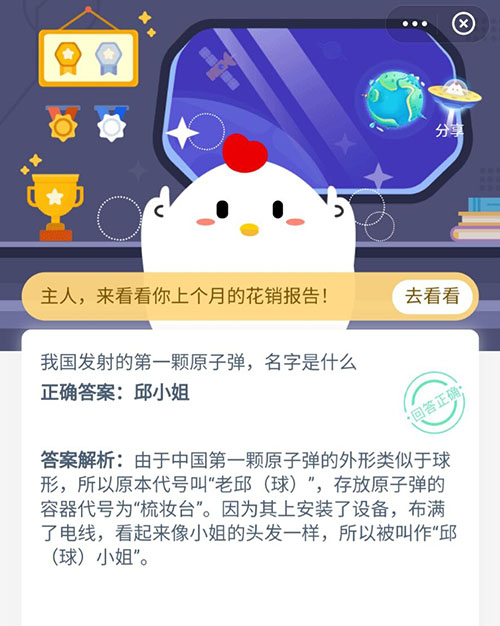 支付宝蚂蚁庄园题目又来了,这一次考验的题材是国家的发展问题,我国发射的第一颗原子弹名字是什么?小伙伴们已经知道正确答案吗?答对就可以领取属于你的小鸡饲料哦,下面一起来看看支付宝蚂蚁庄园10月23日答案是什么。