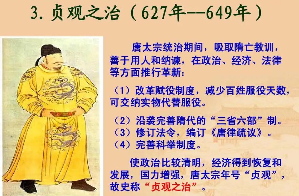 贞观之治是唐朝初年唐太宗李世民在位期间出现的政治清明、经济复苏、文化繁荣的治世局面。贞观之治为后来全盛的开元盛世奠定了重要基础,将中国传统农业社会推向鼎盛时期。以农为本,厉行节约,休养生息,文教复兴,完善科举制度等政策,使得社会出现了安定的局面;并大力平定外患,尊重边族风俗,稳固边疆,最终取得天下大治的理想局面。