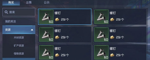 除此之外,螺钉也可以通过交易行购买获得,直接在购买界面点进“拾荒资源”那一类目,然后即可看到成堆的螺钉,这个资源本身价值不高,一组售价为29金砖,而且无需担心卖完的情况,因为它基本上每天都是有很多货的,所以金砖足够的话可以直接去交易行进货。