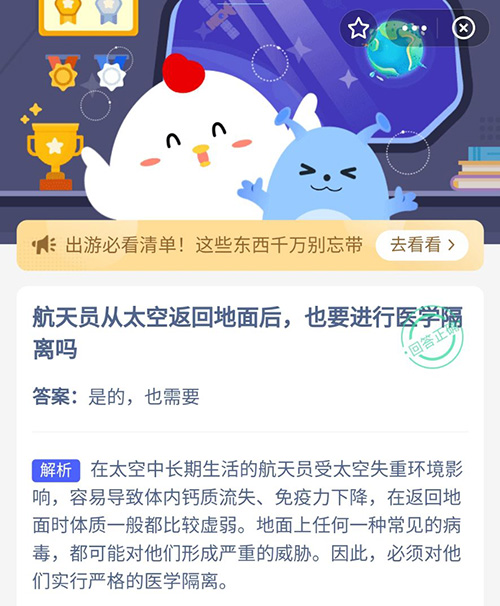 航天员从太空返回地面后,也要进行医学隔离吗?在今天的支付宝蚂蚁庄园中,关于宇航员返回地球之后需不需要隔离的问题,想知道答案的小伙伴们,赶紧和小编一起看看9月30日的正确答案吧。