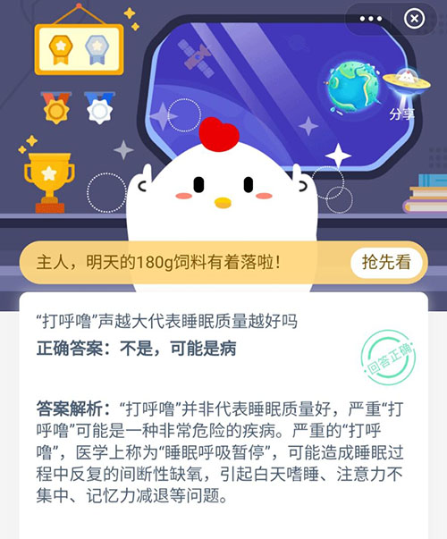 在睡觉的时候经常能遇见打呼噜的情况,对于睡眠质量浅的小伙伴来说简直就是非常煎熬的事情。就在今天的支付宝小鸡答题中就问到这个问题:声音越大睡眠质量越好吗?睡觉打呼噜真的能确定你的睡眠质量吗?下面一起看看正确答案吧。